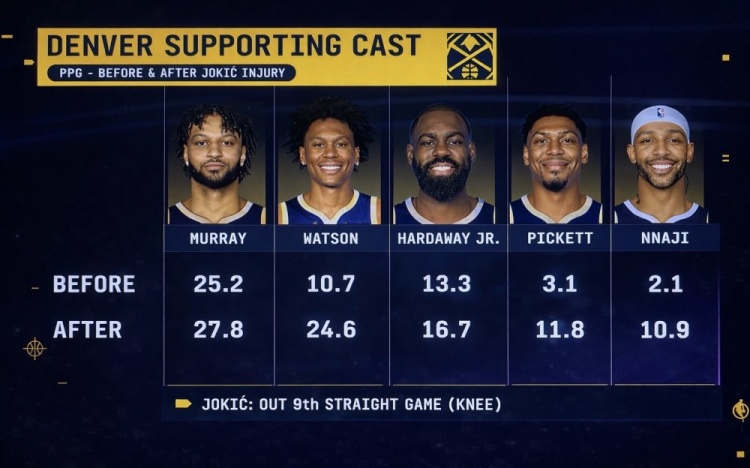 半岛体育官网-队安勿归?约基奇受伤前后 穆雷&沃特森等掘金5将场均得分对比